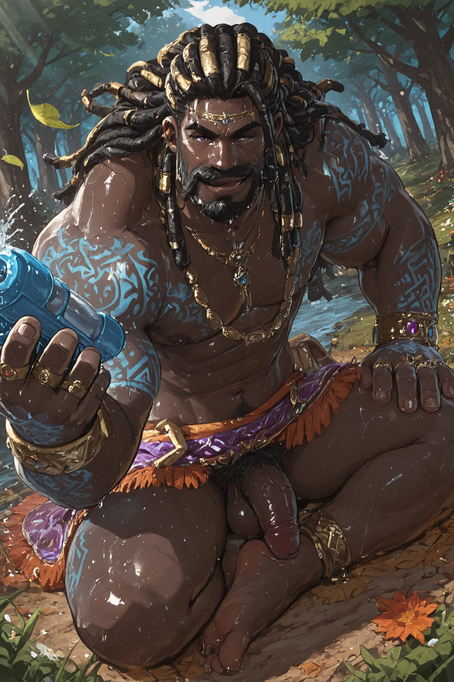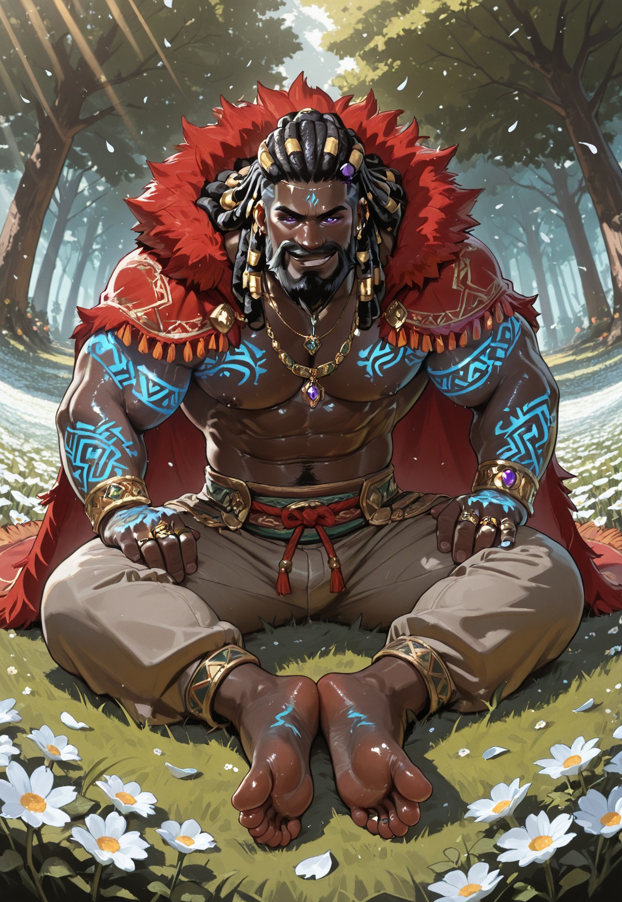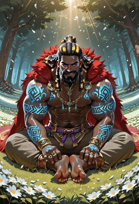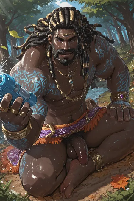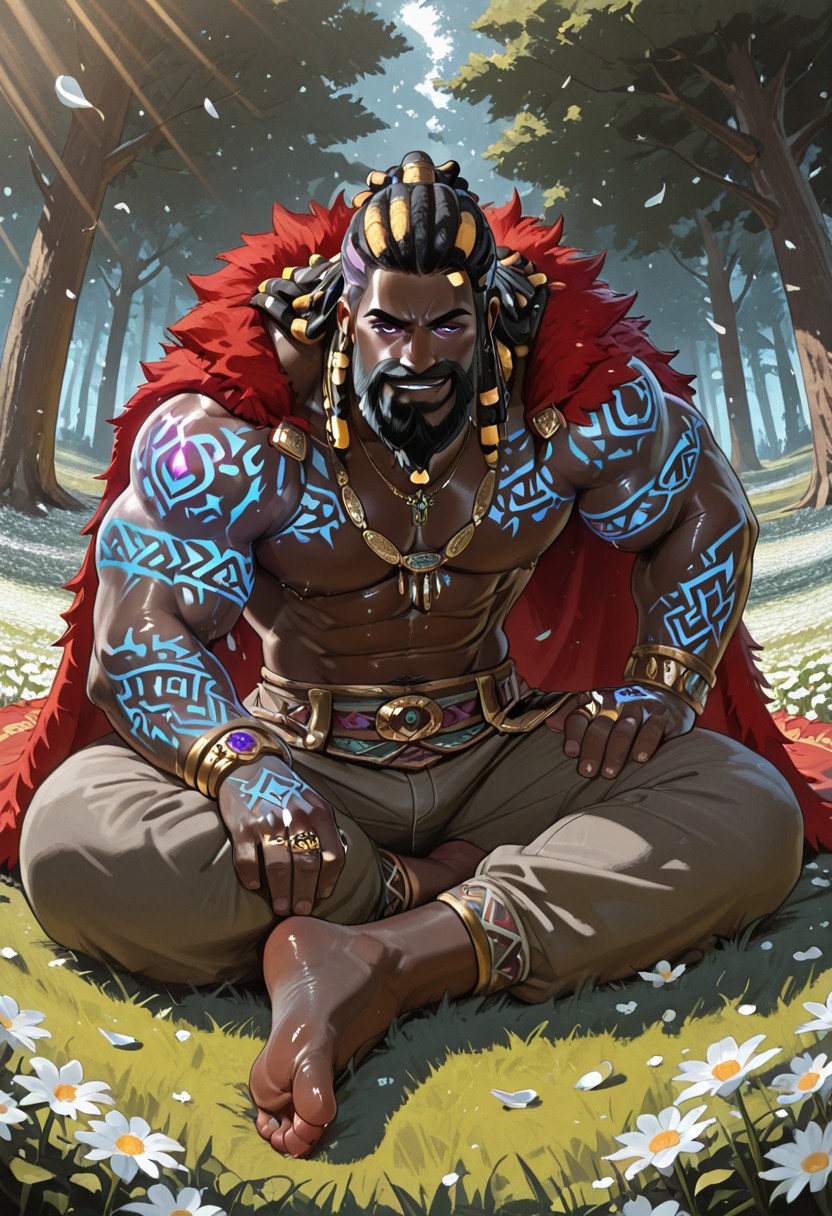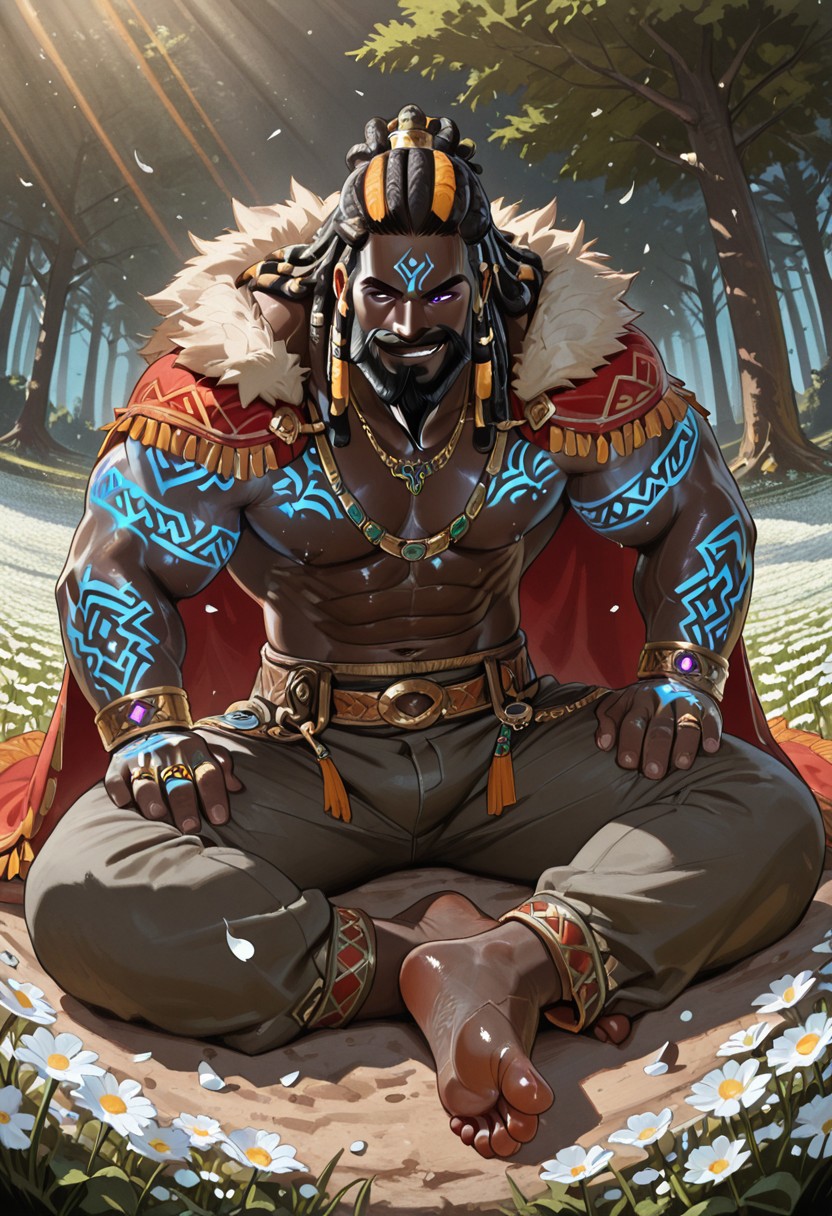 | 训练词汇 | 1boy, tagatamegormalas,very dark skin, bara, mature man, big muscle, muscular body, round face, two-tone hair, long hair, dreadlocks, (purple eyes:0.8), beard, moustache, 已复制! glowing tattoo, rings, bracelets, necklace, pants, jewelry, red fur-trimmed cape,已复制! |