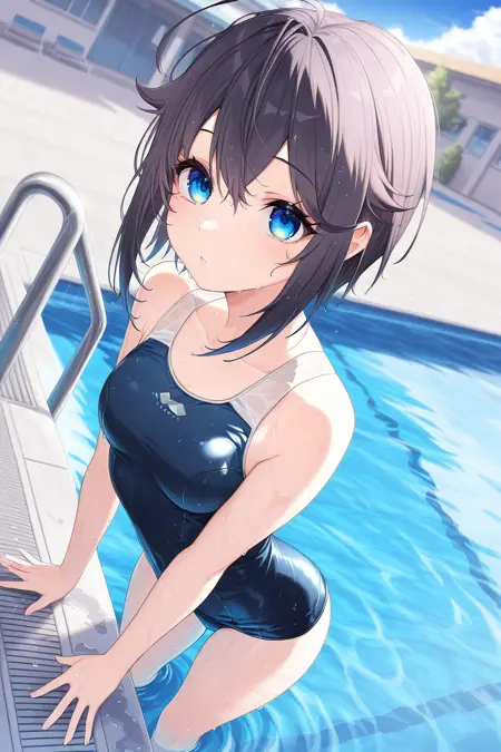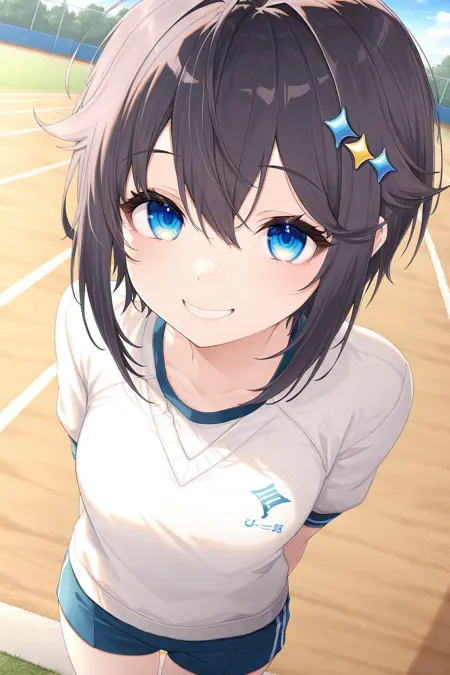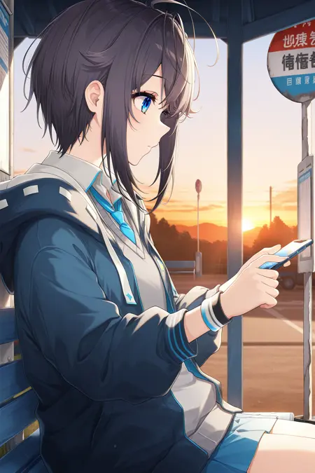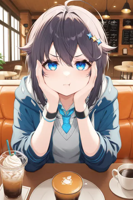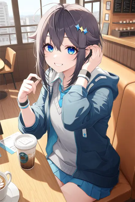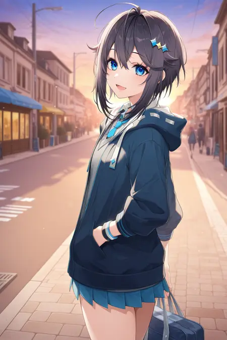 short hair, black hair, eyelashes, blue eyes, ahoge, short hair with long locks, sparkle_hair_ornament, blue jacket, hooded jacket, long sleeves, wristband, collared shirt, blue necktie, grey sweater, blue skirt, pleated skirt, vertical-striped socks, loafers