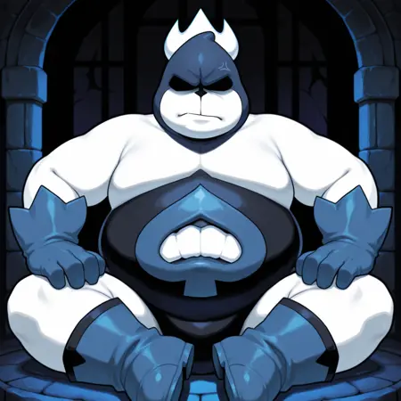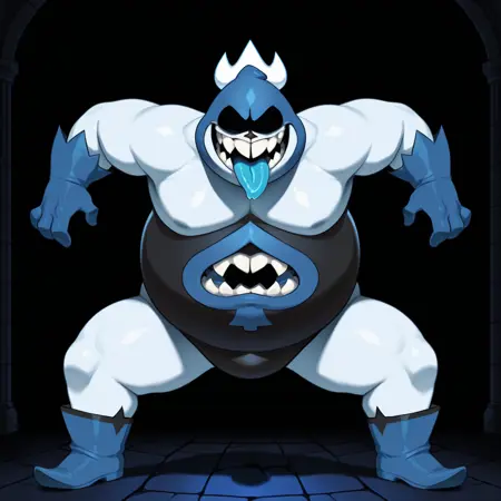 kingspade, deltarune, plump, monster, anthro, 1boy, solo focus, white skin, white body, fat, plump, blue head, shadow on face, no eyes, black nose,