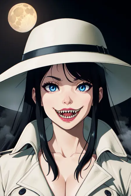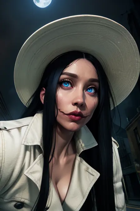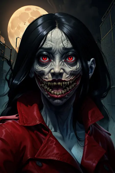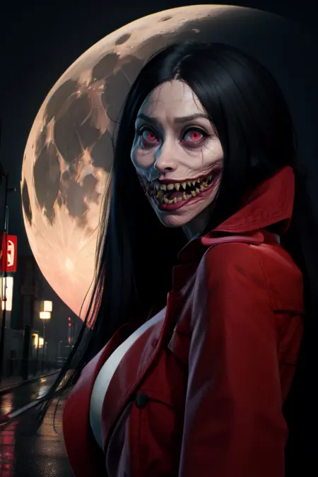 Kuchisake, black hair, red sclera, white eyes, - uneven eyes,