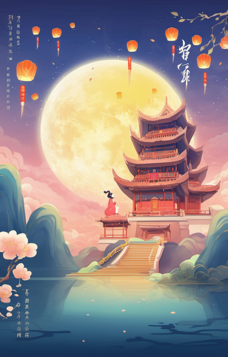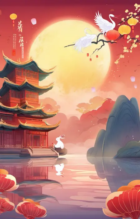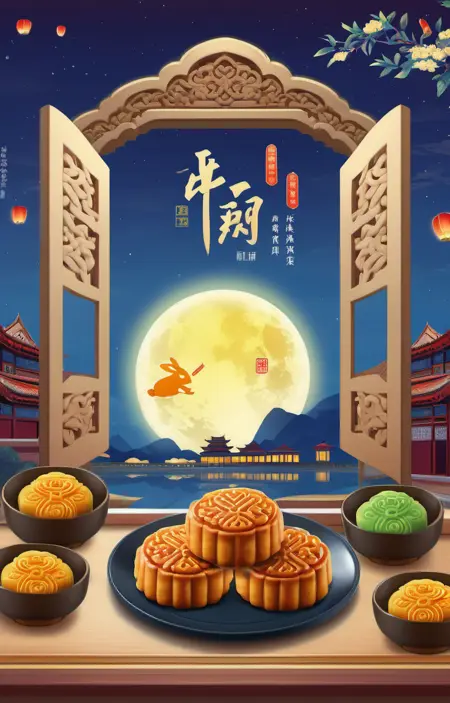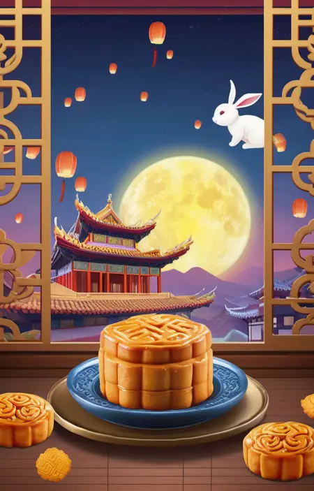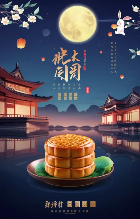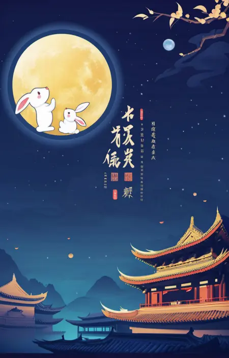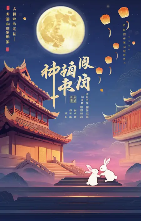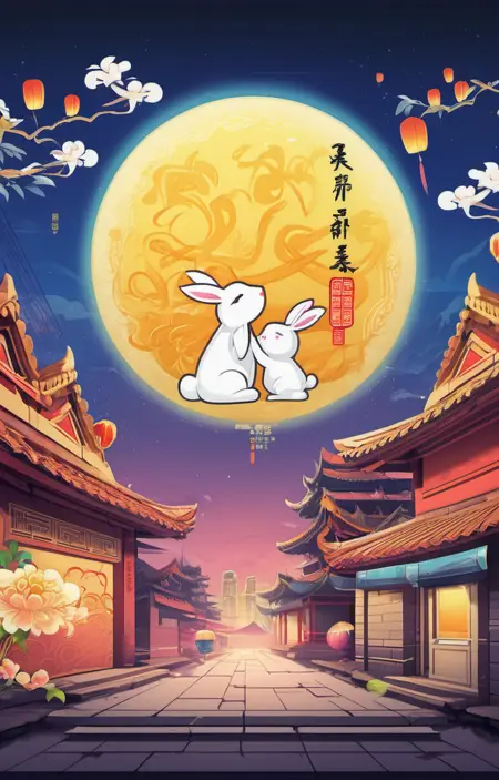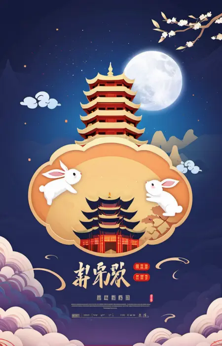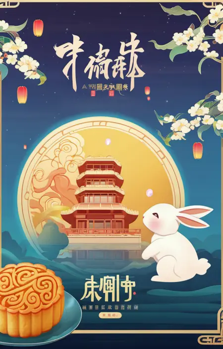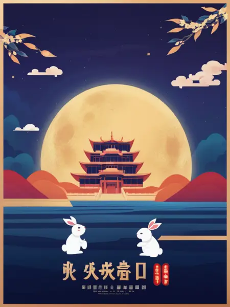 긍정적 프롬프트: masterpiece, best quality, lora:zqhb-000009:0.8, scenery, bunny, east_asian_architecture, full_moon, poster design, night_sky, border, say, put the mooncakes on the plate,