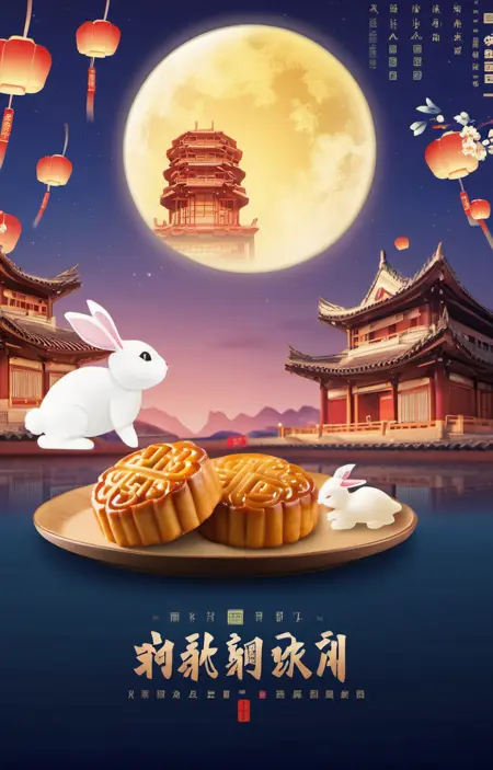 Positive prompt words: masterpiece, best quality, lora:zqhb-000009:0.8, scenery, bunny, east_asian_architecture, full_moon, poster design, night_sky, border, say, put the mooncakes on the plate,