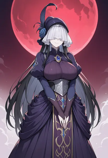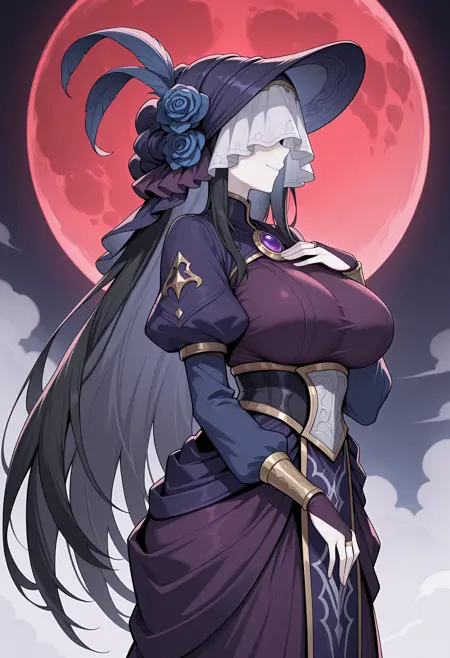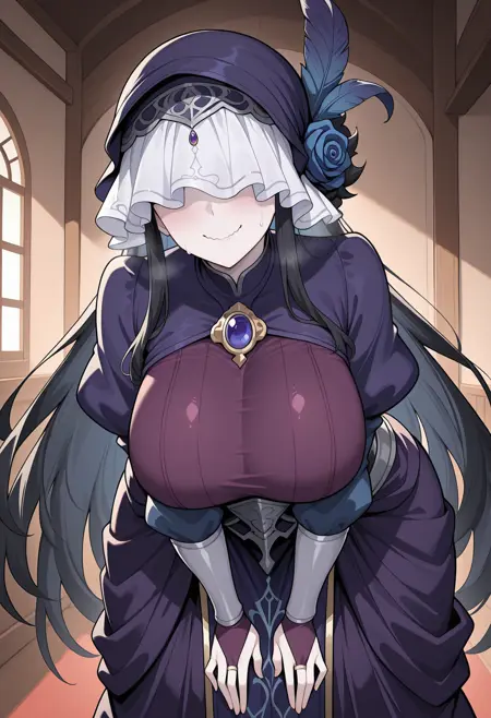 보라색 드레스, 눈가리개, 모자, 모자 깃털, 베일, 파란 장미, 브로치, 보석, 푹신한 긴 소매, 신부 장갑, 긴 드레스, 토바드,