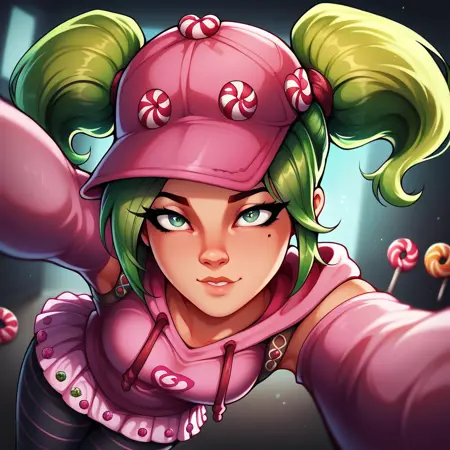 TAG: score_9, score_8_up, score_7_up, sexy eyes, perfect eyes, sexy eyes, detailed eyes, source_cartoon, Expressiveh, Zoey, 1girl, green hair, twintails, green eyes, Striped pants, Pink skirt, High detail, Black and gray striped pants, Green hair, More clear facial details, pink sleeveless hoodie, pink baseball cap, candy, black and white striped legwear, pink cowboy boots, lora:ZoeyFortnite:1