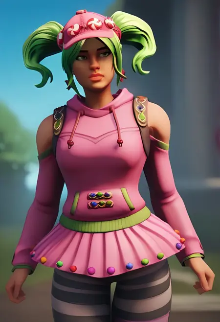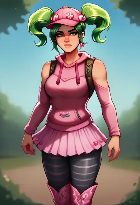 TAG: score_9, score_8_up, score_7_up, セクシーな目, 完美的な目, セクシーな目, 詳細な目, source_cartoon, Expressiveh, Zoey, 1girl, 緑色の髪, ツインテール, 緑色の目, 縞模様のパンツ, ピンクのスカート, 高詳細, 黒とグレーの縞模様のパンツ, 緑色の髪, より明確な顔の詳細, ピンクのノースリーブパーカー, ピンクの野球キャップ, キャンディー, 黒と白の縞模様のレッグウェア, ピンクのカウボーイブーツ, lora:ZoeyFortnite:1