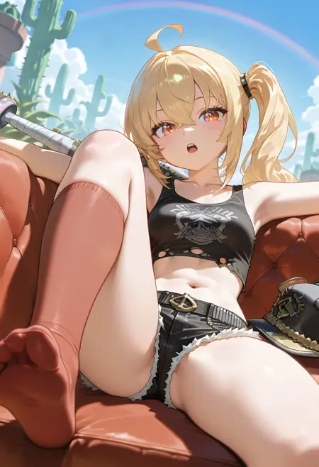 衣装のタグ: ベースボールキャップ, 黒いヘルメット, 長袖, 黒い手袋, 腹出し, 開いたジャケット, 黒いジャケット, クロップドトップ, 黒いシャツ, 短いショーツ, 黒いショーツ, チェーン, 黒いベルト, クロップドジャケット, デニムショーツ, ベルトのバックル, クロップドシャツ, カットオフ, ガスマスク, ハーフグローブ, 首周りのマスク,