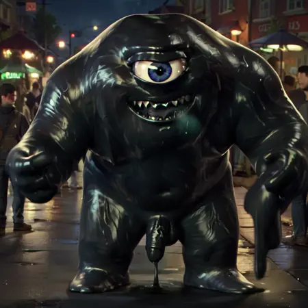 score_9, score_8_up, score_7_up, score_6_up, score_5_up, rating explicit, cowboy shot, 1 boy, solo, boardroom location, day, T4RM0NST3R, melting, tar monster, tar elemental, golem, cyclops, one-eyed, wet, dripping, puddle, tar, oily black body, sheen, smile, sharp teeth, black tongue, chubby, (blob), feet featureless crotch, laying,, ball busting lora:tarmonster:0.8