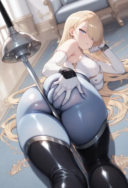 主な衣装タグ: ボディーストッキング, ノースリーブシャツ, 肘までの手袋, 太ももブーツ(希望があれば ハイヒール も)。必要に応じて 白いシャツ を追加してください。
