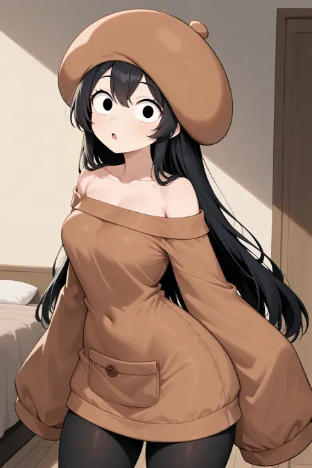 衣装:長袖、ベレー帽、茶色の頭飾り、茶色のドレス、指先よりも長い袖、黒いレギンス、片肩出し、肩出し、ポケット