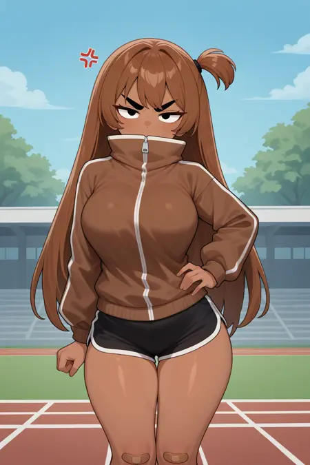 Outfit: bandaid on knee, short shorts, dolphin shorts, black shorts, zipper, brown jacket, track jacket, turtleneck jacket