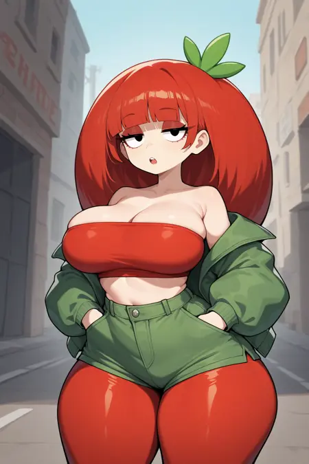 Outfit: leaf hair ornament, open jacket, red tube top, green jacket, off shoulder, bare shoulders, red pantyhose, green shorts, short shorts