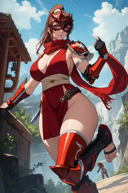 女忍者部分:****红色忍者装, 侧乳,头巾,腰带,红色(单肩甲:1.1),单手套,手套,胯部遮帘