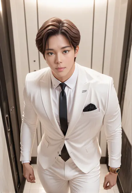 white suit, bts, korean, solo, realistic, brown hair, formal, suit, short hair