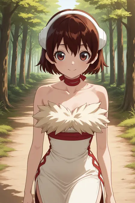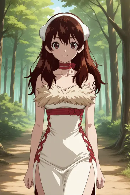 aayuzuriha, brown eyes, brown hair, short hair, white headband, red choker, white dress, bare shoulders, strapless dress, side slit dress, collarbone, fur trim, anime coloring,