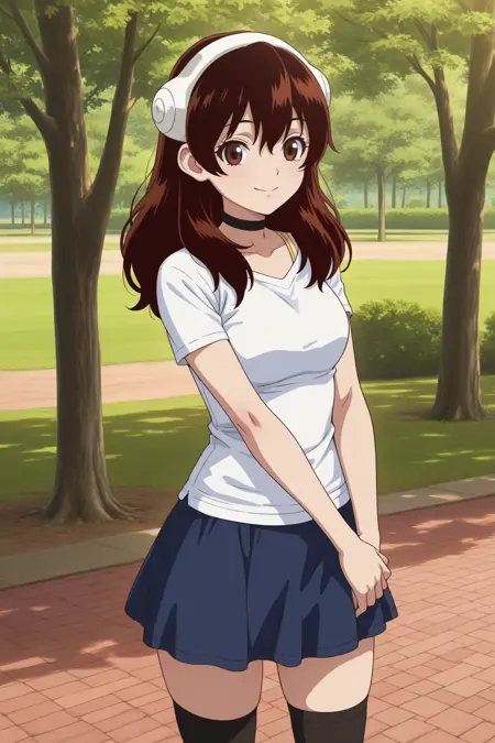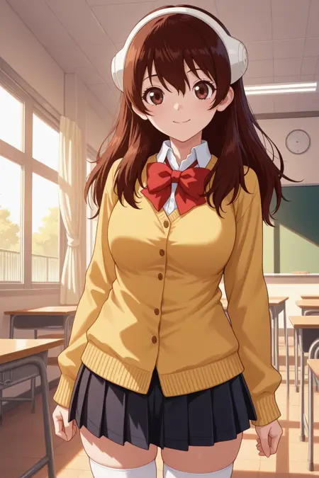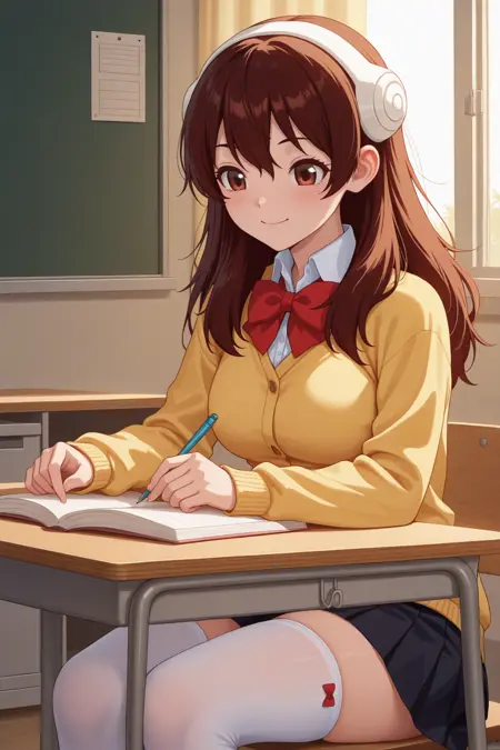 ayuzuriha, brown eyes, brown hair, long hair, white headband, school uniform, red bow, white shirt, collared shirt, yellow cardigan, long sleeves, black skirt, pleated skirt, white thighhighs, anime coloring,