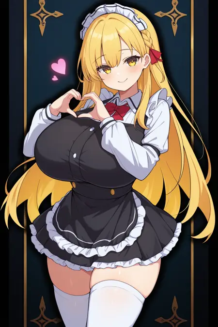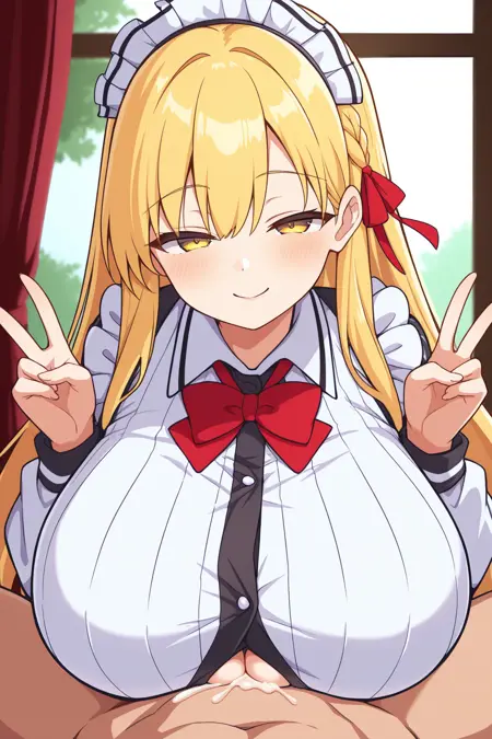 lucasmaid6135, blonde hair, long hair, yellow eyes, braid, hair ribbon, red ribbon,