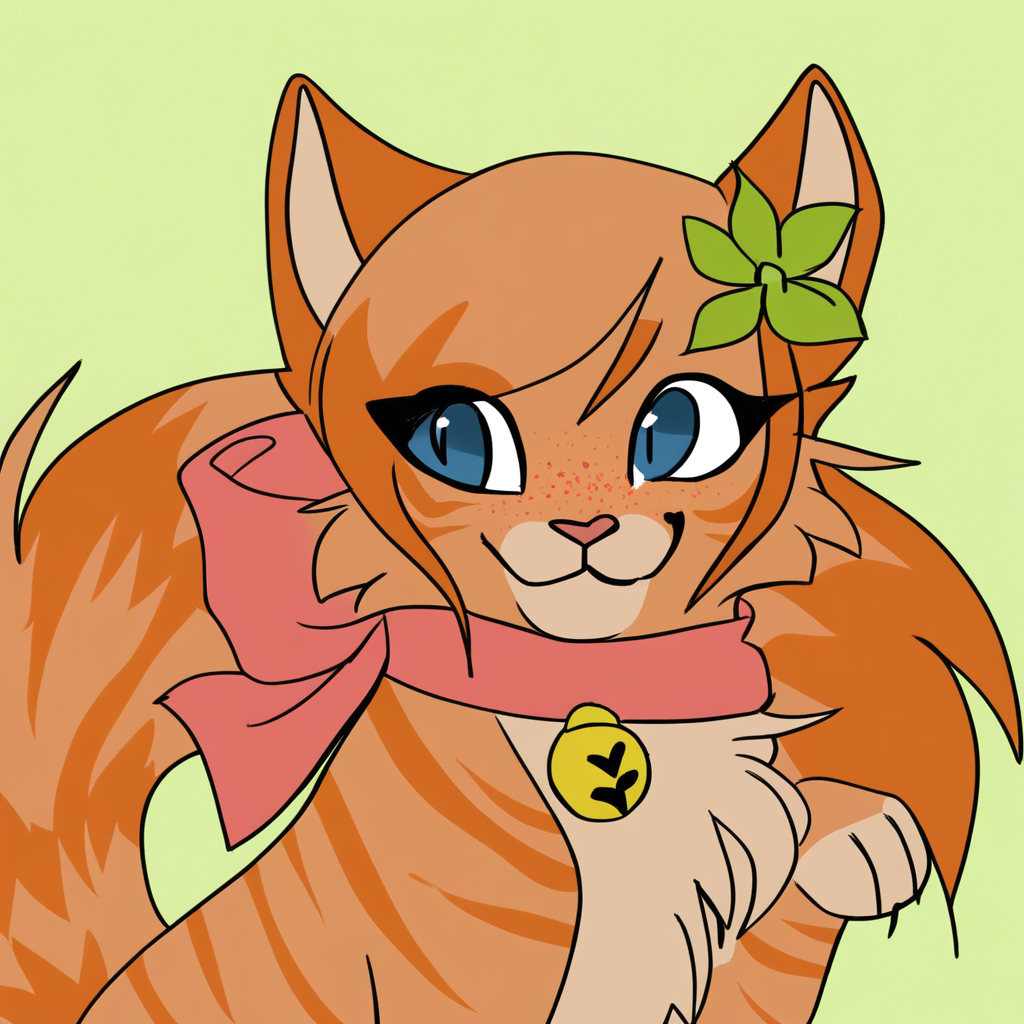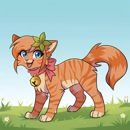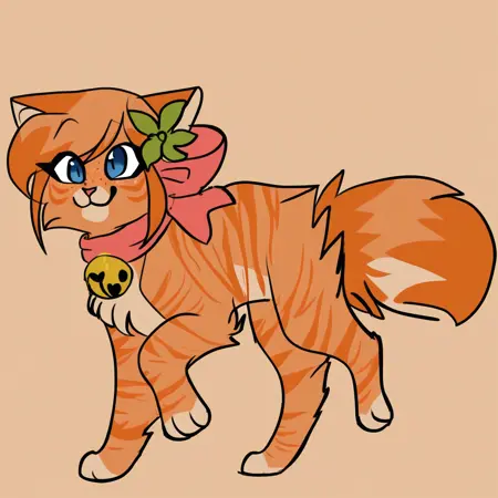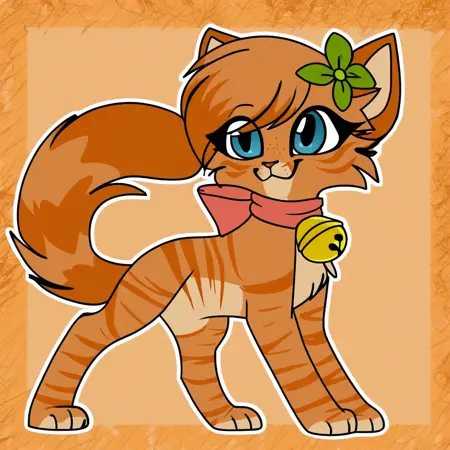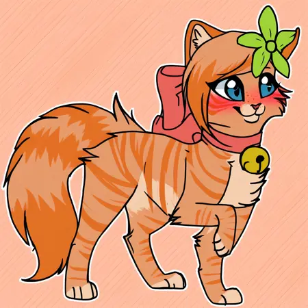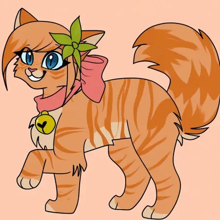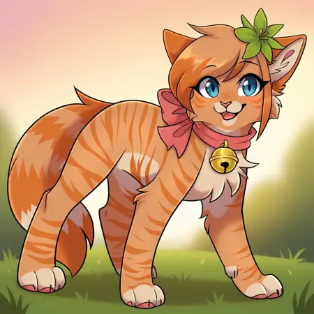 Tags: Rea, Ginjaninjaowo_rea, solo, furry, cute, feral, 1girl, cat, tabby, catgirl, orange fur, orange and apricot orange fur, light orange chest, light orange crotch, orange stripes, apricot orange and orange hair, fluffy tail, eyelashes, blue eyes, pink red nose, orange tips hair, orange tail, striped tail, cat nose, long tail, orange bangs, light orange freckles, orange striped fur, pink bow, pink neck bow, pink bow on neck, gold bell on bow, green flower on right side of head, orange heart on right side of chest,