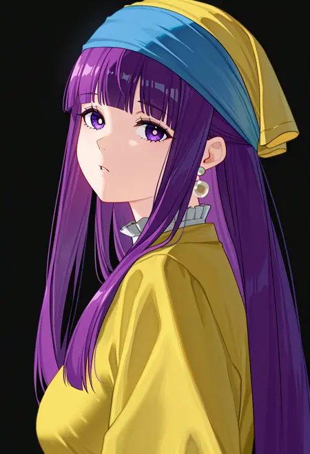 トリガー語: gwape、イヤリング、真珠のイヤリング、ジュエリー、開いた唇、青いヘッドバンド、黄色いヘッドスカーフ、黒い背景