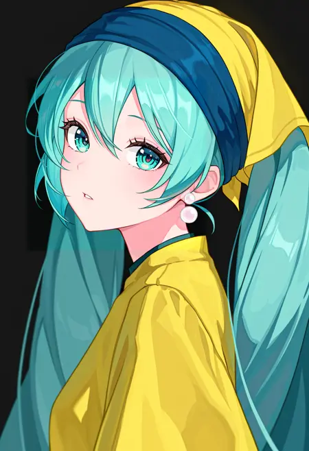 Trigger word: gwape, earrings, pearl earrings, jewelry, parted lips, blue headband, yellow head scarf, black background