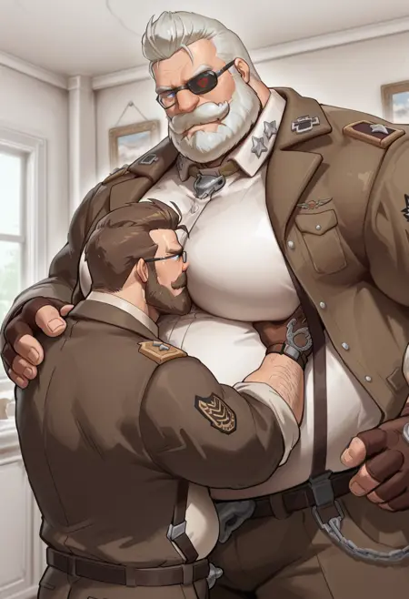 gldlws_ggs, 1boy, facial hair, mustache, glasses, fat, blue eyes, military uniform, necktie, glasses, eyepatch, bara,