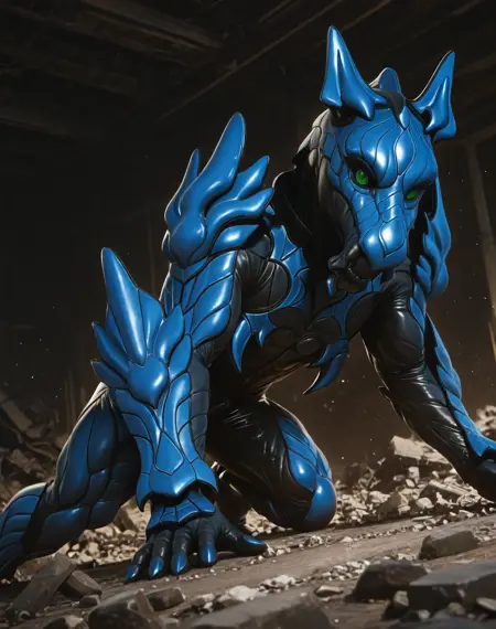 このLoRA用のプロンプトは以下の通りです:(Horse_Fangire, Kamen Rider Kiva, fangire, horse, armor,)。