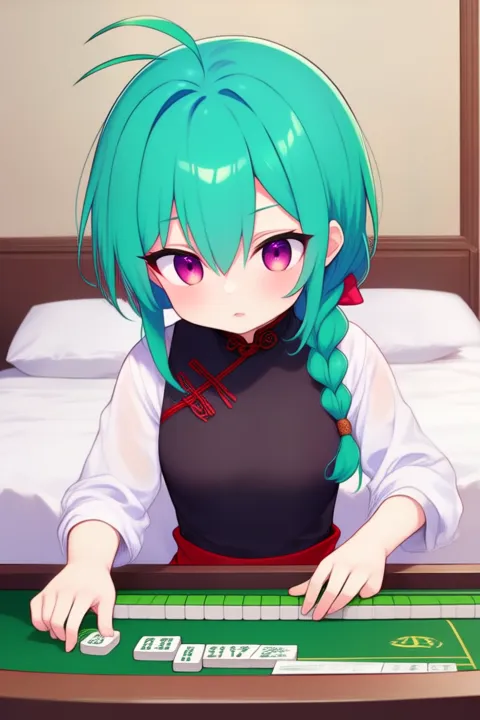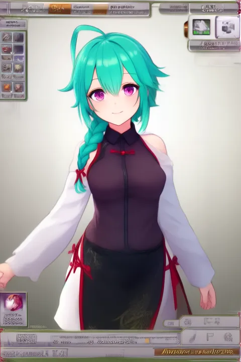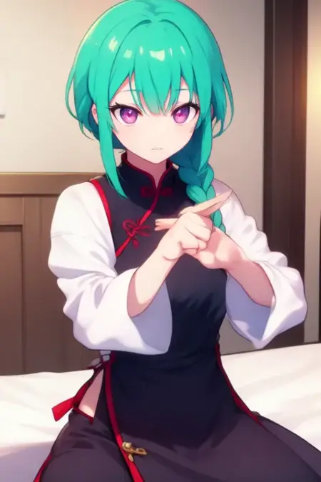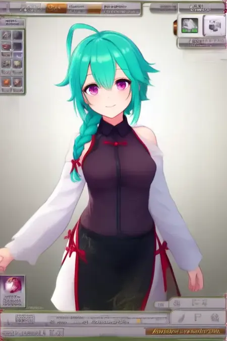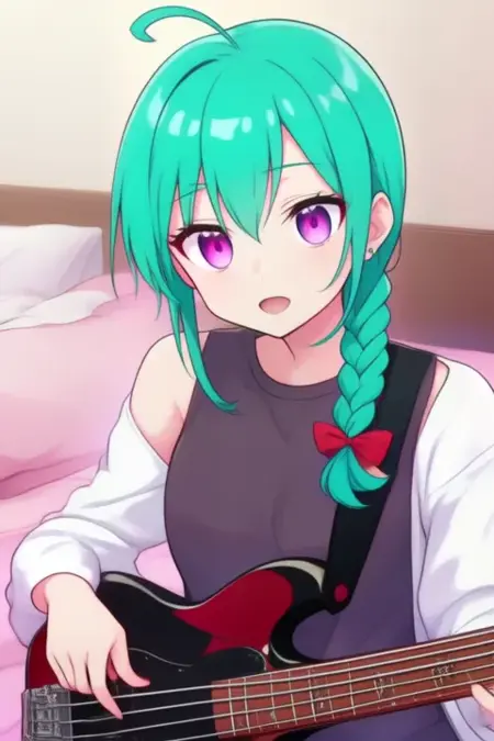 触发词:Ryushen,动漫风格女孩。图像 featuring 一位动漫风格的角色,拥有鲜艳的青绿色头发,编成两条辫子。角色拥有大而富有表现力的紫色眼睛,身着深色服装。上衣内搭一件白色衬衫,部分可见。角色的着装还包括一条黑色围裙,边缘为红色,并在腰部系着一个红色蝴蝶结。