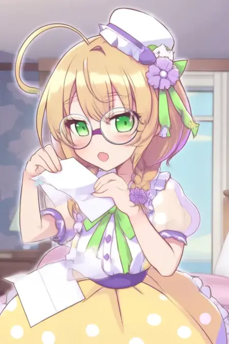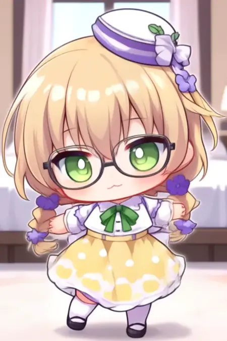 サンプルプロンプト: Yaguruma Rine, アニメ風の女の子。画像には、薄い金髪を二つ編みにし、紫の花で飾ったアニメ風のキャラクターが登場します。キャラクターの目は緑色で、眼鏡をかけています。衣装は、白地に黒のドット模様のブラウスと、白いドット模様の黄色のスカートです。ブラウスの首元には緑のリボンが結ばれており、胸元には小さなリボンがついています。また、キャラクターは紫の花と小さな装飾が付いたヘアバンドを着けています。頭には、紫の帯と前面に小さな花の装飾がついた白い帽子をかぶっています。 (彼女は踊っている:2.5), (ちびネンドロイド:3.5)、寝室で。