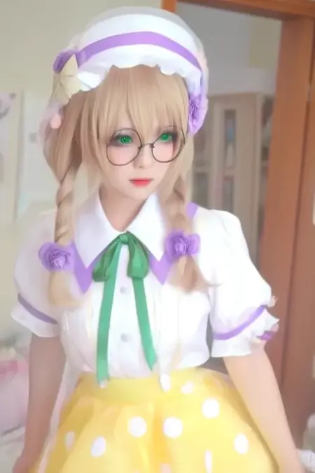 トリガーワード: Yaguruma Rine, アニメ風の女の子。画像には、薄い金髪を二つ編みにし、紫の花で飾ったアニメ風のキャラクターが登場します。キャラクターの目は緑色で、眼鏡をかけています。衣装は、白地に黒のドット模様のブラウスと、白いドット模様の黄色のスカートです。ブラウスの首元には緑のリボンが結ばれており、胸元には小さなリボンがついています。また、キャラクターは紫の花と小さな装飾が付いたヘアバンドを着けています。頭には、紫の帯と前面に小さな花の装飾がついた白い帽子をかぶっています。