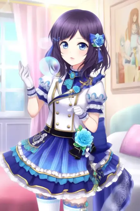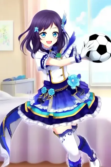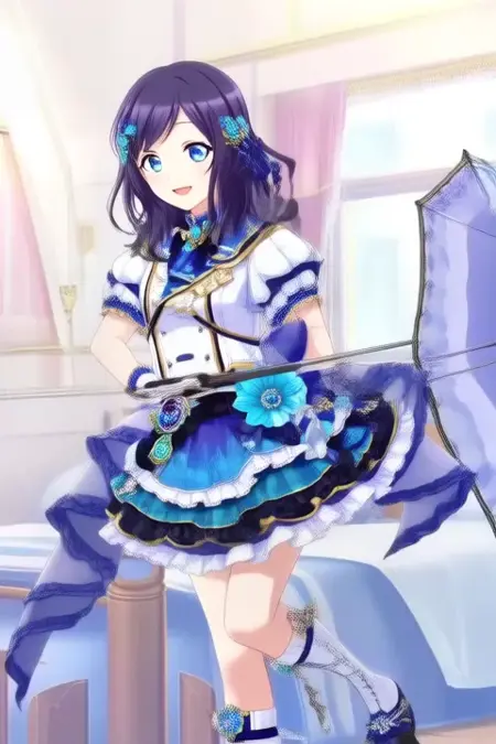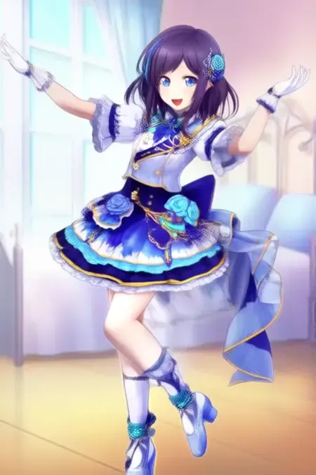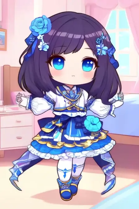 sample prompt:Aiba Uiha, anime-style girl. The image features an anime-style character with long, dark purple hair adorned with blue ribbons and flowers. The character has large, expressive blue eyes. She is wearing a detailed outfit that includes a white blouse with ruffled sleeves, a blue and white skirt with multiple layers and decorative elements, and knee-high socks with blue and white patterns. The character is also wearing white gloves and has a blue flower accessory on her wrist. (she is dancing:2.5), (chibi Nendoroid:3.5) in bedroom.