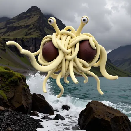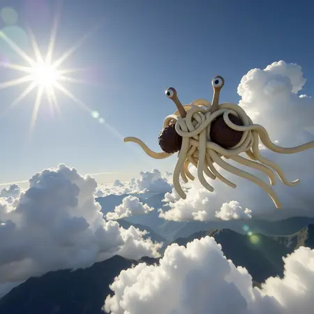 请尝试使用其中一个或两个作为触发词。如果你使用首字母大写的“飞行意大利面怪物”,可能会得到一个FSM头部连接在身体上的图像。
