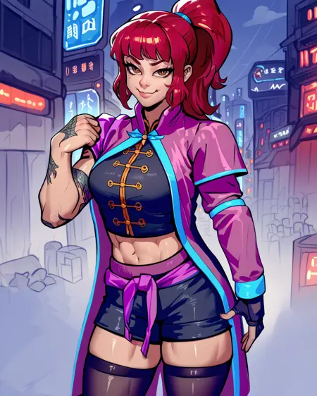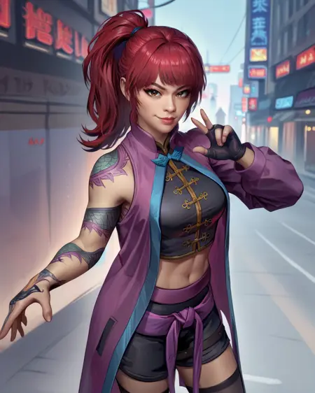 black chinese top, purple coat, shorts, thighhighs, midriff, single glove,