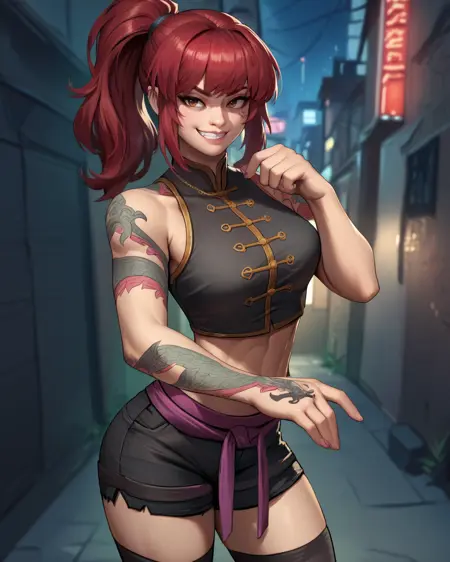 KimWU, red hair, ponytail, brown eyes, arm tattoo,