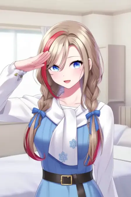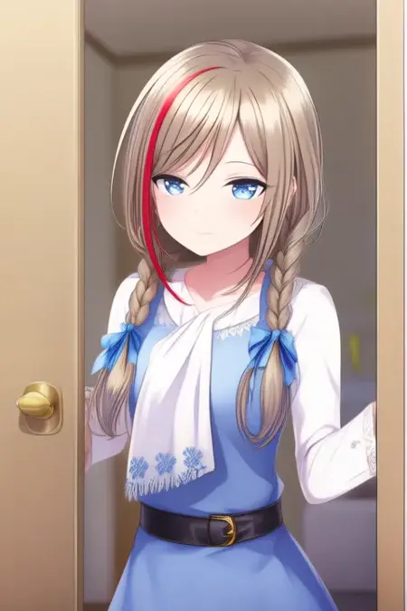 触发词:Kurusu Natsume,动漫风格女孩。图像呈现一位动漫风格的角色,拥有长发,编成两条辫子,发色为金色,夹杂浅棕与红色高光。角色拥有醒目的蓝色眼睛,身穿白色高领衬衫,内搭蓝色连衣裙,腰间系有黑色腰带,颈部围着一条带有蓝色花卉图案的白色围巾。衬衫的颈部和肩部系有蓝色丝带。