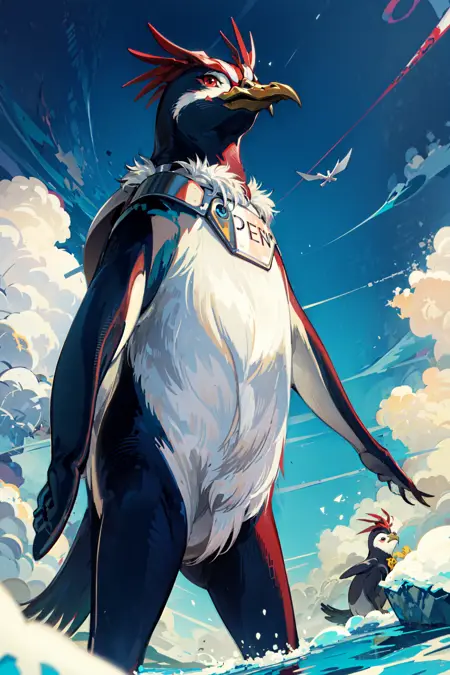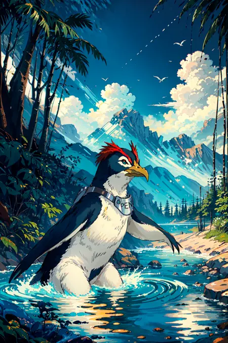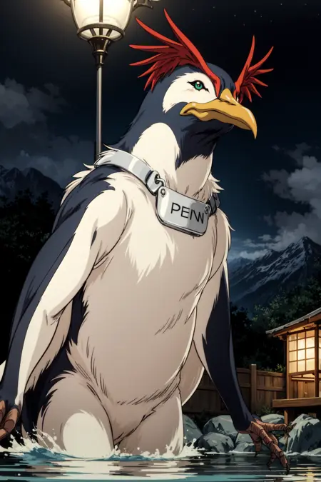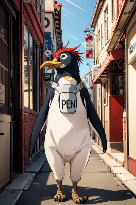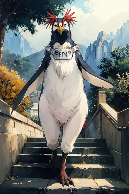 主要なプロンプト単語: ペンギン、動物、動物に焦点、緑の目、首輪
