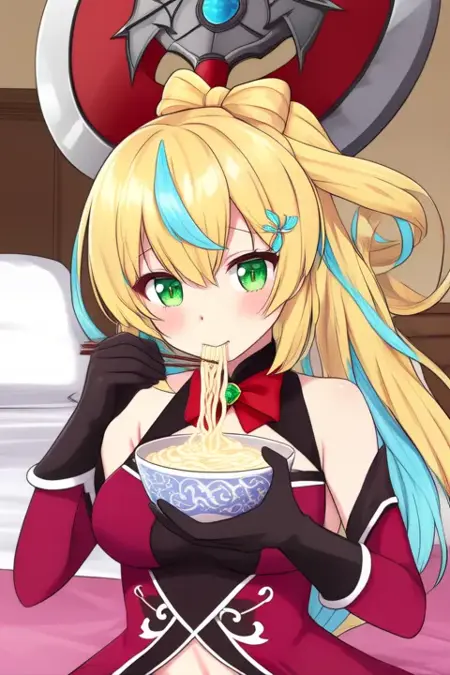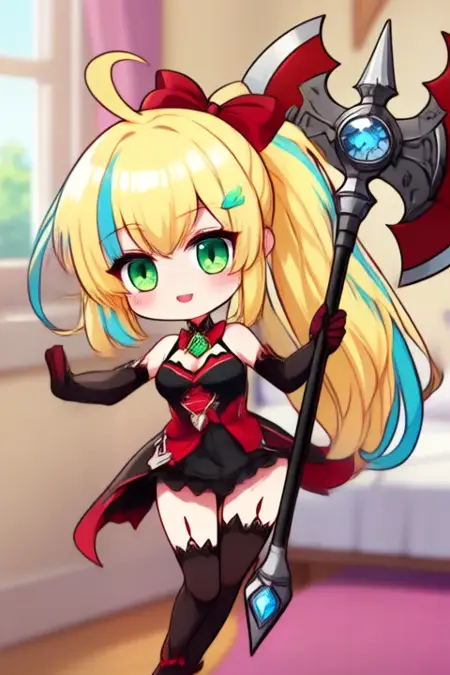 サンプルプロンプト:Tachitsute Toto、アニメスタイルの女の子。画像には、青みがかったストライプとトップにリボンが付いた長い流れるような金色の髪を持つキャラクターが描かれています。目の色は緑です。衣装は黒と赤を基調とした複雑な模様が施されたデザインで、上着は高めのネックラインを持つフィットしたドレス。黒いボディと白いアクセントが入った赤い袖が特徴です。首には緑の宝石が付いた赤いリボンが結ばれており、全体に優雅さを加えています。また、白い cuffs の付いた黒い手袋を着用しており、全体の色調と調和しています。右手には、赤い刃と銀色の柄、藍色の宝石が取り付けられた大きな斧を握っています。(彼女は踊っている:2.5)、(ちびネンドロイド:3.5)で、寝室の中。