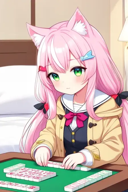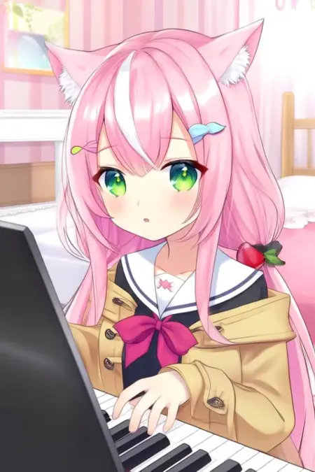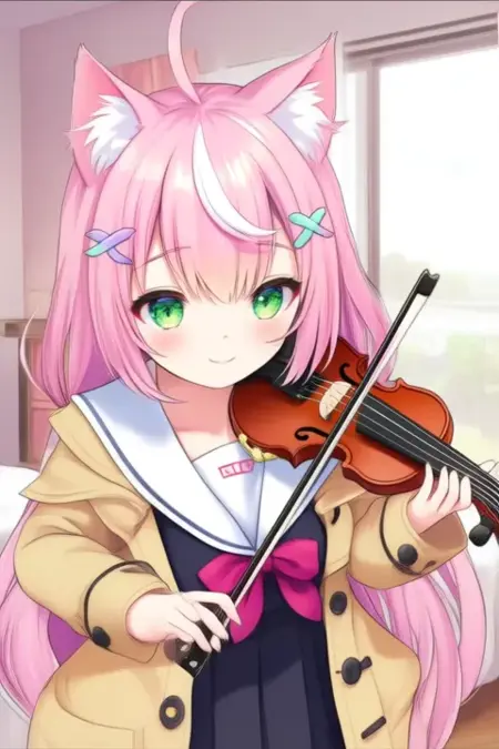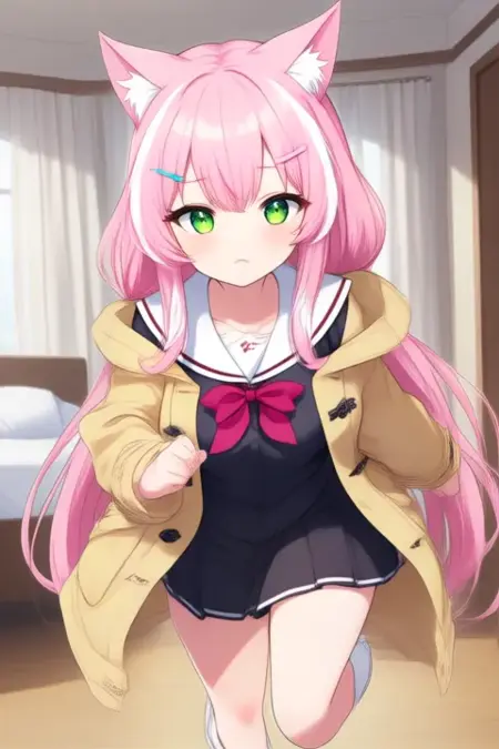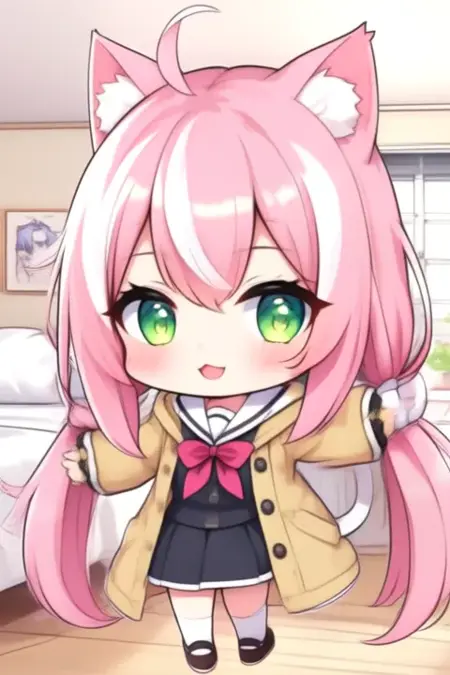 샘플 프롬프트: Yang Nari, 애니메이션 스타일 소녀. 이미지는 긴 분홍색 머리카락을 두 개의 땋은 머리로 묶고, 흰색 줄무늬와 작은 리본이 있는 캐릭터를 특징으로 합니다. 캐릭터는 머리 위에 분홍색이며 안쪽이 흰색인 고양이 귀를 가지고 있습니다. 눈은 녹색이며, 빨간 넥타이를 매단 흰색 셔츠를 입고 있습니다. 캐릭터는 검은 장식이 있는 노란색 코트와 검은 치마를 입고 있습니다. (그녀가 춤추고 있음:2.5), (치비 넌도로이드:3.5) 침실에서.