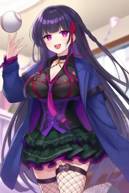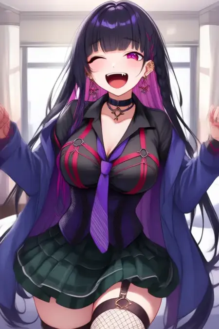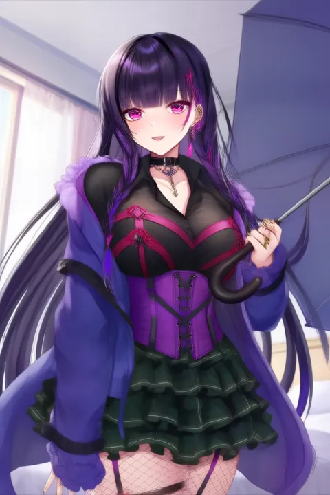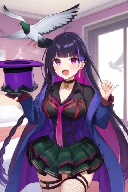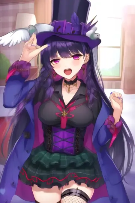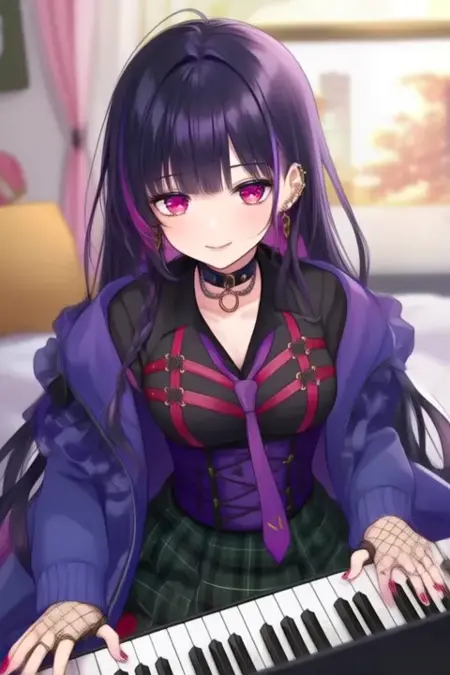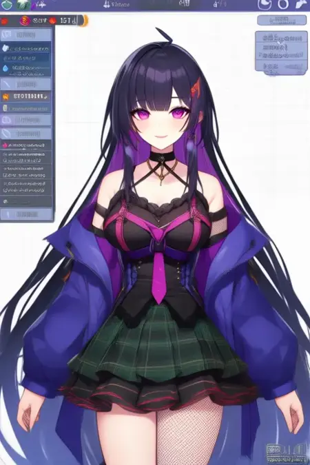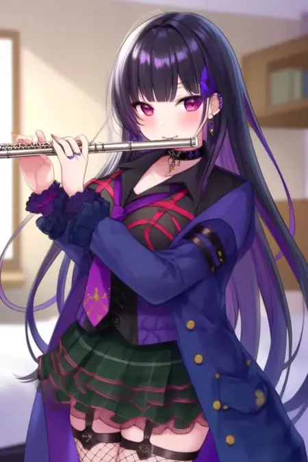 트리거 단어: Kyoran Meloco, 애니메이션 스타일 소녀. 이미지에는 어깨까지 떨어지는 두 개의 땋은 긴 진보라색 머리카락을 가진 캐릭터가 등장합니다. 캐릭터는 뚜렷한 분홍색 눈을 가지고 있으며, 검정과 보라색으로 이루어진 옷을 입고 있습니다. 상의는 빨간 액센트와 높은 칼라가 있는 검정 블라우스에 보라색 코르셋이 매치되며, 핑크 액센트가 있는 검정 상의(초코렛과 스트랩 포함)를 입고 있습니다. 이 상의는 주름진 헴이 있는 녹색 체크 스커트와 매치됩니다. 위에는 무릎까지 내려오는 길고 흐르는 파란색 코트를 입고 있으며, 코트는 높은 칼라를 가지고 있고 부드럽고 질감 있는 원단으로 만들어진 듯 보입니다. 캐릭터는 피시넷 스타킹을 신고 있습니다. 전체적인 옷차림은 고딕 또는 빅토리아 스타일의 미학을 줍니다.