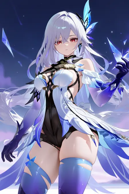 skirk \(Genshin Impact\), 1girl, 白髪, 赤い目, 長髪, シングル, 髪飾り, 手袋, デタッチソール, バタフライ髪飾り, 手袋, グラデーションレッグウェア, ピアス, ジュエリー