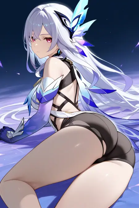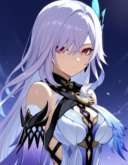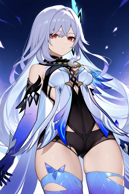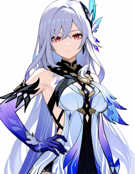 skirk (genshin impact), 1girl, 흰 머리, 빨간 눈, 긴 머리, 혼자, 머리 장식, 장갑, 분리된 소매, 나비 모양 머리 장식, 장갑, 그라데이션 다리 착용, 귀걸이, 보석