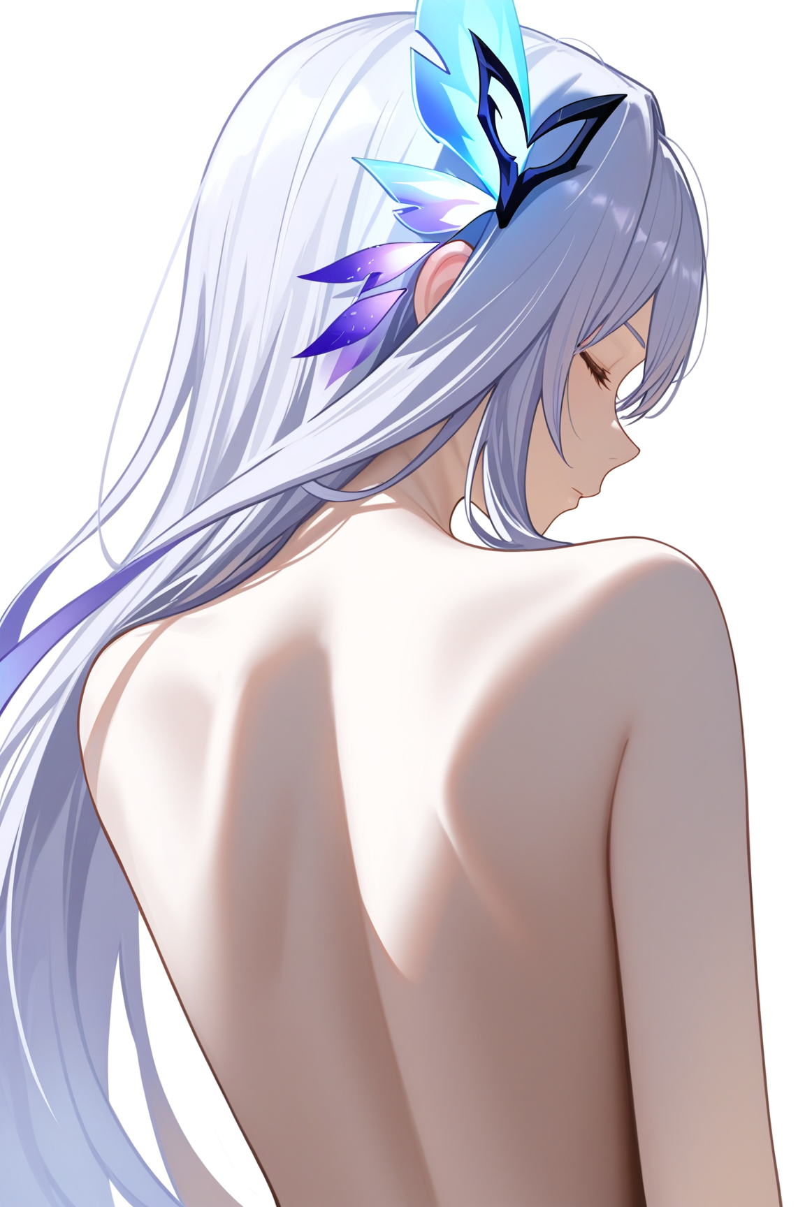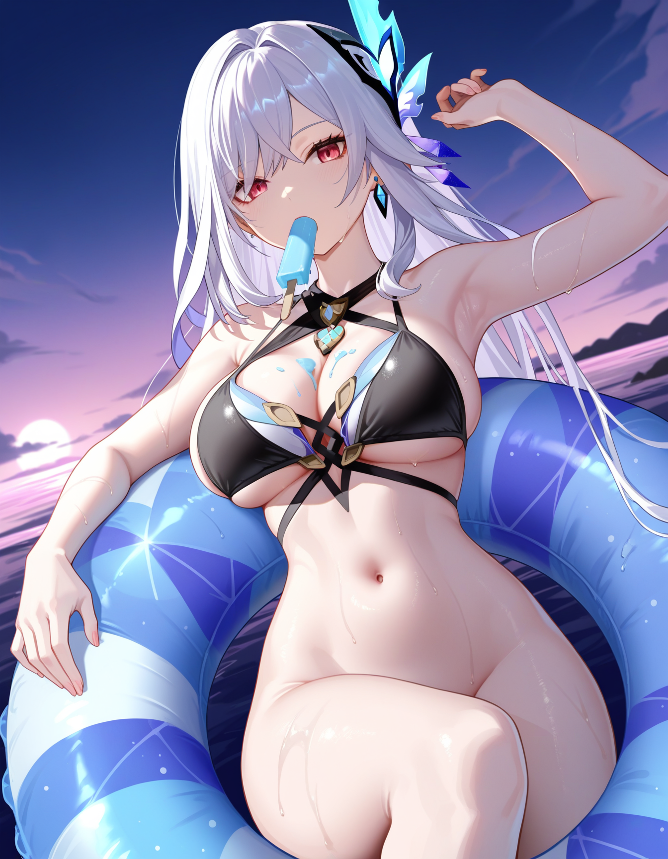 skirk \(Genshin Impact\), 1girl, 白髪, 赤い目, 長髪, シングル, 髪飾り, 手袋, デタッチソール, バタフライ髪飾り, 手袋, グラデーションレッグウェア, ピアス, ジュエリー
