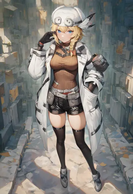 일반 복장: 장갑, 긴 소매, 모자, 서 있는 자세, 벌어진 옷, 반바지, 검은 장갑, 검은 투이하이, 흰 코트, 짧은 반바지