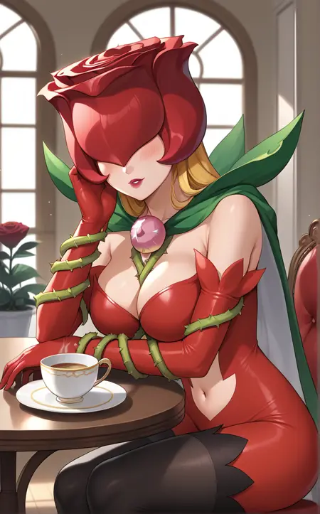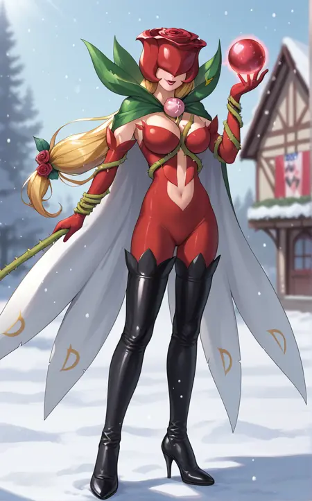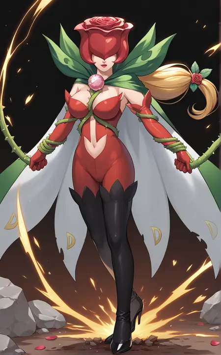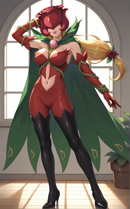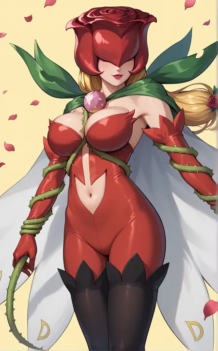MAIN_YUGIHO_Rosemon_ownwaifu, 1girl, covered eyes, vines, thorns, blonde hair, red lips, helmet, rose, spikes, no eyes, high collar, digimon (creature), lipstick, makeup, cleavage, green cape, large breasts, elbow gloves, red gloves, clothing cutout, monster girl, navel cutout, plant girl, red flower, red rose, thighhighs, red bodysuit, long hair, hair ornament, hair flower, bare shoulders, brooch, gem, navel, detached sleeves, collarbone, black thighhighs,