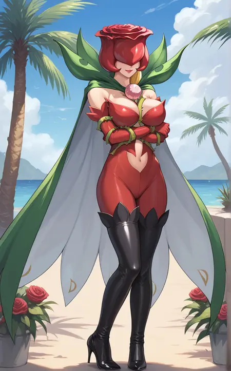 Bikini_YUGIHO_Rosemon_ownwaifu, 1girl, covered eyes, red lips, blonde hair, helmet, thorns, vines, cleavage, digimon (creature), elbow gloves, hair flower, hair ornament, high collar, highleg bikini, jewelry, large breasts, lipstick, makeup, navel, no eyes, red bikini, red gloves, rose, skindentation, spikes, swimsuit, underboob, green cape, groin, red flower, red panties, red rose, red thighhighs, thick thighs, long hair, monster girl, plant girl, revealing clothes, rose petals,