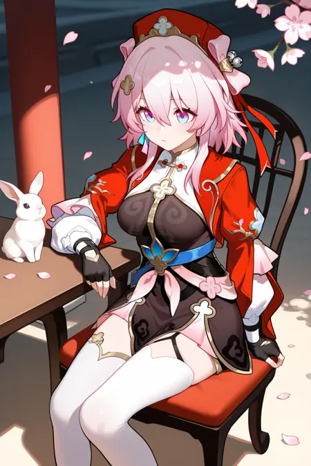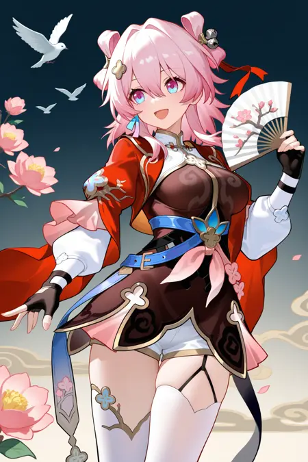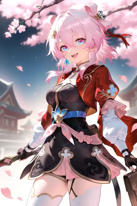 march 7th \(hunt\) \(honkai star rail\), 1girl, solo, gloves, bell, thighhighs, breasts, black gloves, long sleeves, hair intakes, fingerless gloves, hair ornament, white thighhighs, jacket, red jacket, chinese clothes, hair bun, ribbon, hair between eyes, garter straps, dress