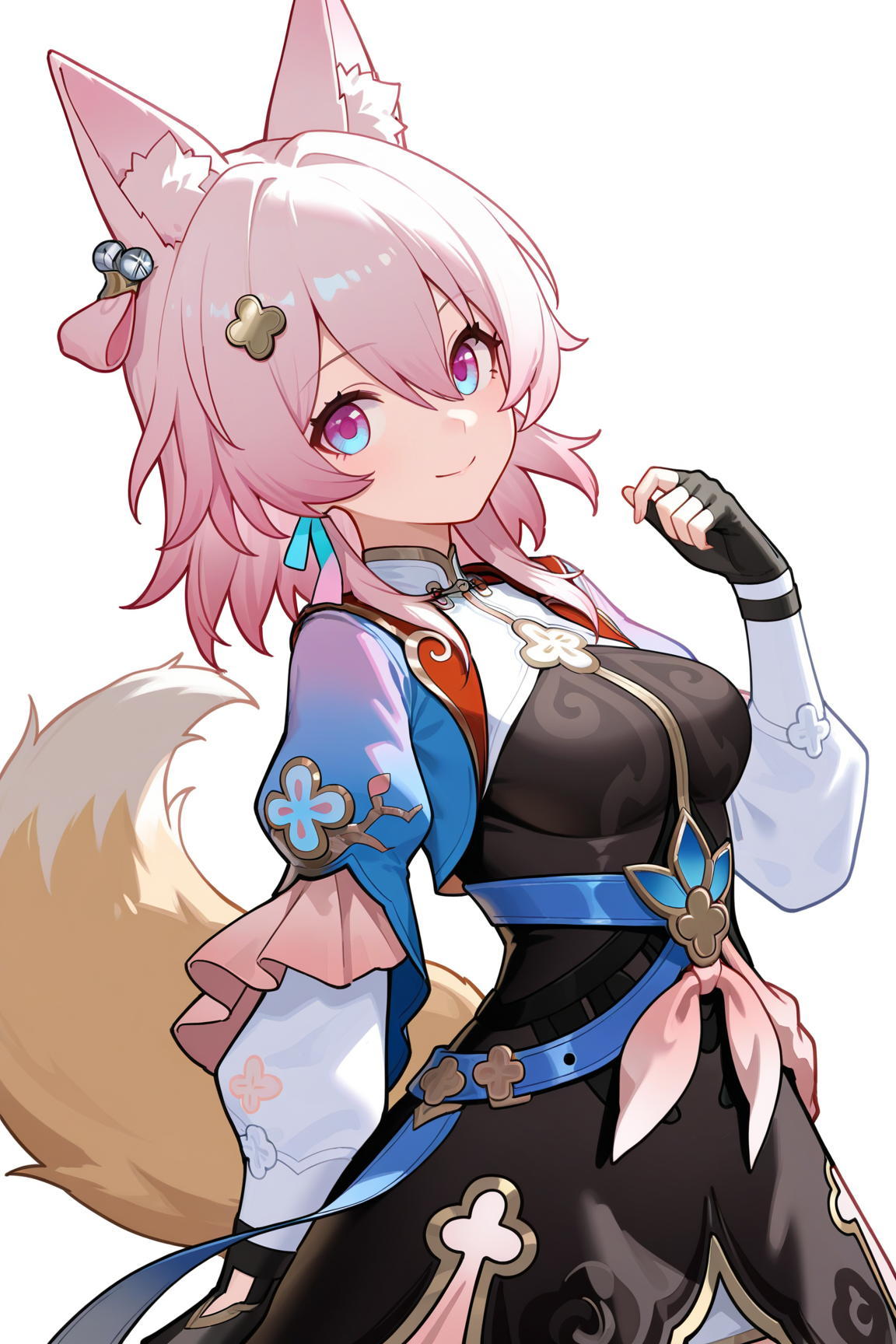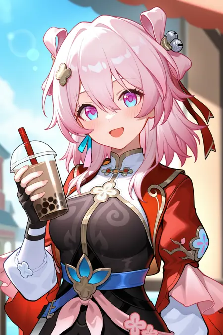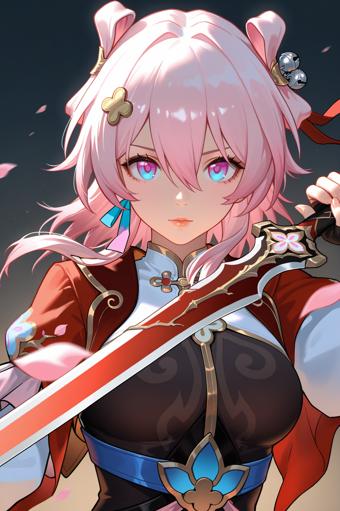 march 7th \(hunt\) \(honkai star rail\), 1girl, hair ornament, bell, dress, red jacket, hair intakes, hair bun, ribbon, chinese clothes,