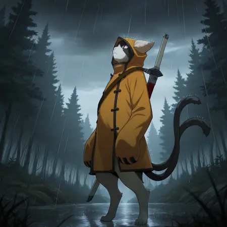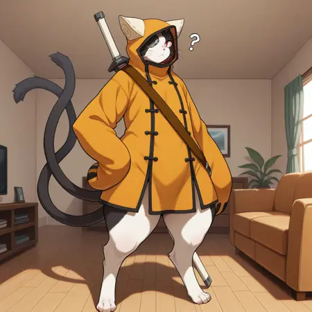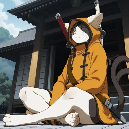 | トレーニングワード | male, furry male, solo, anthro, cat, black fur, white fur, two-tone fur, red eyes, slit pupils, whiskers, pink nose, sharp teeth, paw pads, two tailsコピーしました! large orange hoodie, black trimmings, buttons, eyepatch, brown strap, sword on backコピーしました! forehead protector, red collar, yellow hoodie, brown tunic, brown beltコピーしました! |