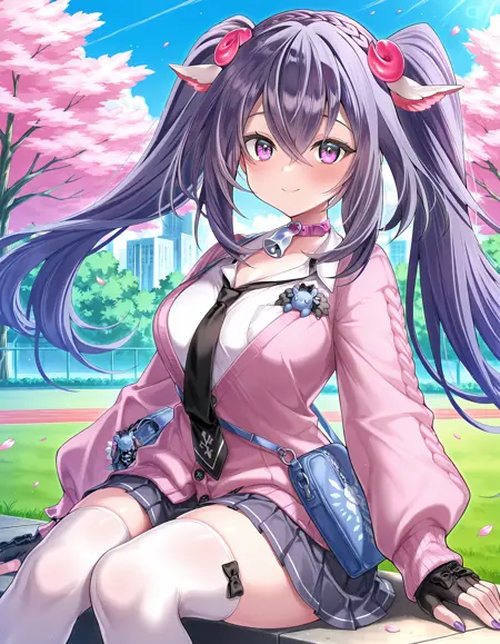garatina \(shironeko project\), 보라색 머리카락, 긴 머리카락, 트윈테일, 땋은 머리, 교차한 앞머리, 측면 머리카락, 눈 사이의 머리카락, 머리 장식, 보라색 눈, 학교 유니폼, 분홍색 목걸이, 목에 달린 종, 분홍색 카디건, 긴 소매, 고리가 있는 셔츠, 검은 넥타이, 손가락 없는 장갑, 보라색 손톱, 주름치마, 어깨 가방, 흰색 허벅지 양말, 검은 활
