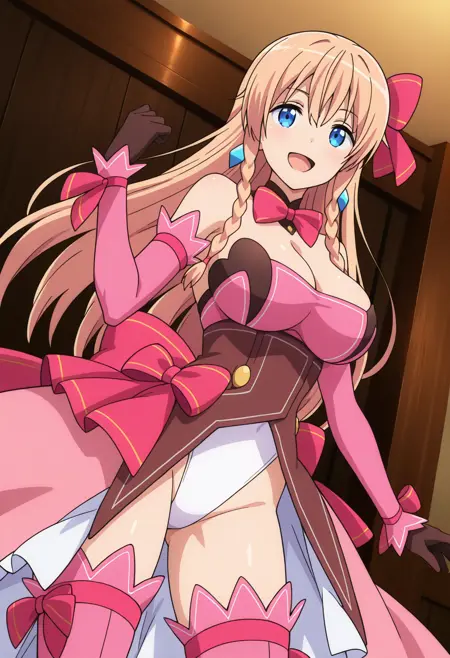 hair bow, red bow, hair ornament, dress, bare shoulders, cleavage, detached collar, detached sleeves, red bowtie, gloves, pink skirt, showgirl skirt, frilled skirt, leotard, pink thighhighs, thigh boots