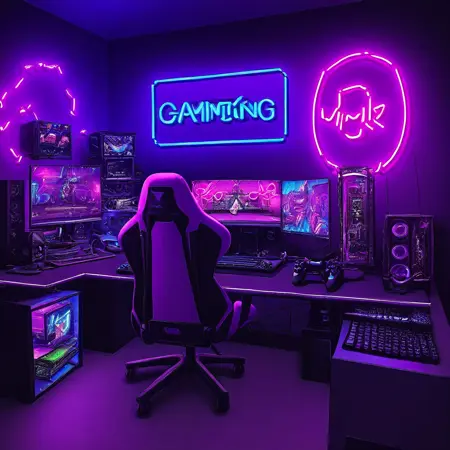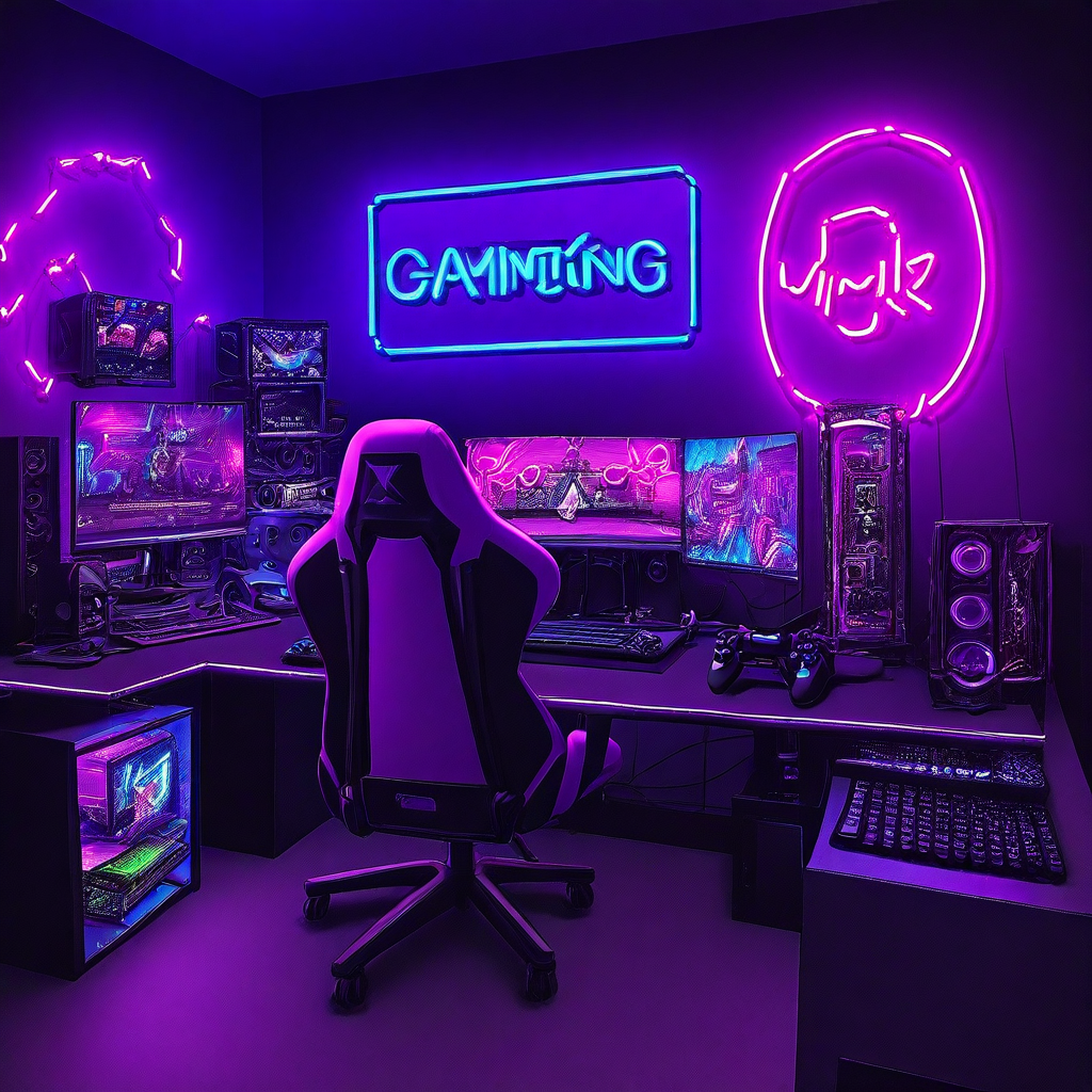 (RGB_Room, 모니터, 게이밍 의자, 컴퓨터, 스피커, 키보드(컴퓨터), 마우스(컴퓨터), 텔레비전, 게임 컨트롤러, 풍경, 책상, 네온 조명),
