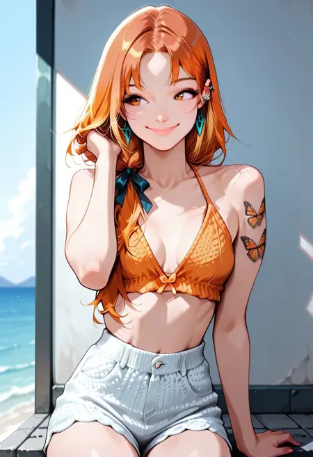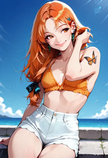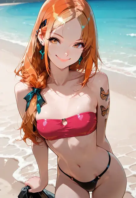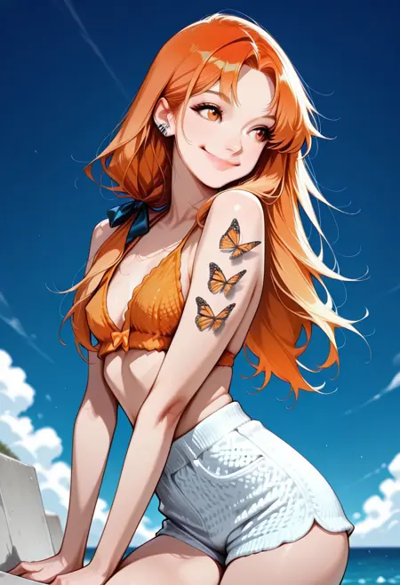 (((orange hair))) , gradient blonde hair, low tied hair, asymmetric hair, long hair, hair ribbon, parted bangs, amber eyes, slim, fit, small breasts,butterfly tattoo on arm, beautiful lips, pierced ears